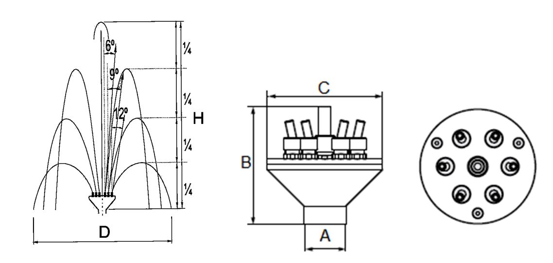 Форсунки-коллекторы серии Crown Special комбинируют разные углы наклона выходных отверстий, в результате создаются параболические струи различной высоты. Эта модель оснащена распределителем потока. Благодаря этому формируется водная картина по форме напоминающая корону. При этом используется единственная подводящая труба. Опционально можно заказать хромирование деталей насадки.